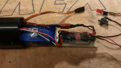 Im Rahmen dieses Updates entschied ich mich ein JETi Max BEC zu verbauen welcher von einem 2S Lipo eingespeist werden soll. Obwohl ein Hacker SB70 Pro als Regler seinen Dienst bestens verrichtet und es mit dem BEC noch nie Probleme gab sollte zukünftig eine lineare Spannungsversorgung den Empfänger doppelt einspeisen. Die optische Akkuzustandsanzeige des Max BEC ist ein sehr nützliches Tool welches sich seit Jahren in anderen Modellen mehr als etabliert hat wenn keine Telemetrie benutzt wird.